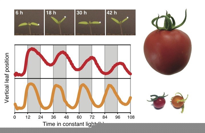 Alle Lebewesen, vom Bakterium bis hin zum Menschen, weisen endogene von der inneren Uhr gesteuerte Rhythmen auf. Diese spielen eine wichtige Rolle bei der Synchronisierung von Organismen mit ihrer Umwelt. Forscher vom Max-Planck-Institut für Pflanzenzüchtungsforschung in Köln konnten zeigen, dass die innere Uhr der kultivierten Tomate während der Domestizierung verlangsamt wurde. Die aus der äquatorialen Region Südamerikas stammende Pflanze wurde vom Menschen in die temperierten Breiten gebracht. Die Verlangsamung der Uhr stellt vermutlich eine Anpassung an die dort herrschenden langen Sommertage dar. Domestizierung verlangsamt die innere Uhr der Tomate. Die Blätter von Tomatenkeimlingen zeigen rhythmische Bewegungen unter konstanten Umweltbedingungen.