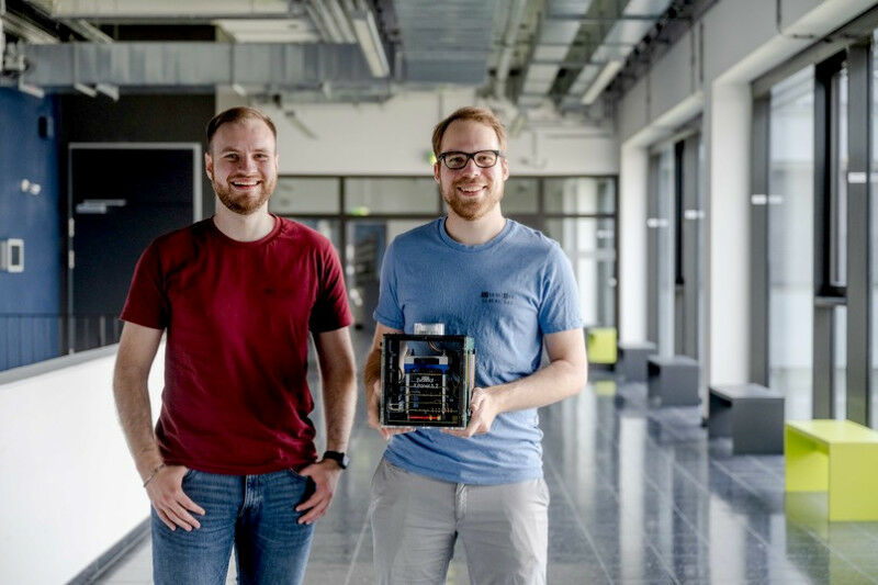 Moritz Schloegel (links) und Johannes Willbold analysierten die Sicherheit von Satelliten. In den Händen halten sie ein Modell eines Kleinsatelliten.