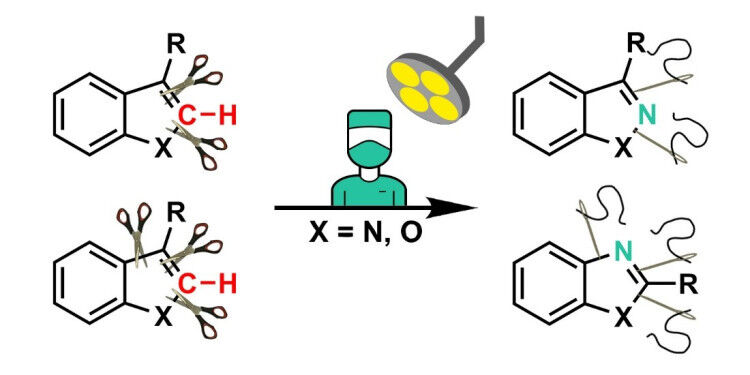 Die in der Fachzeitschrift ,,Nature" veröffentlichte Studie zeigt, dass sich Indole durch den C-zu-N-Atomtausch in Indazole umwandeln lassen. Die Umwandlung erfolgt über Zwischenprodukte mit geöffnetem Molekülring, aus denen sich - durch eine Verschiebung des Stickstoff-Atoms - auch Benzimidazole herstellen lassen. Die gleiche Strategie lässt sich bei Benzofuranen anwenden, die je nach Richtung der strukturellen Neuzusammensetzung entweder Benzisoxazole oder Benzoxazole ergeben. Diese Verbindungsklassen - Indazole, Benzimidazole, Benzisoxazole und Benzoxazole - sind für ihre biologische Aktivität und ihre weite Verbreitung in Therapeutika und Naturstoffen bekannt.
