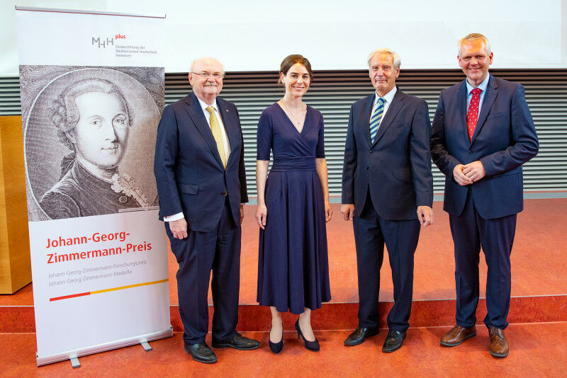 MHH-Präsident Michael Manns, die beiden Preisträger PD Dr. Anna Saborowski und Christoph Huber sowie Wissenschaftsminister Björn Thümler Copyright: Karin Kaiser / MHH - Die Förderstiftung MHH plus zeichnet Christoph Huber und Anna Saborowski aus / Preisverleihung durch Wissenschaftsminister Björn Thümler und MHH-Präsident Prof. Michael Manns Stand: 13. Der Johann-Georg-Zimmermann-Forschungspreis und die Johann-Georg-Zimmermann-Medaille gehören zu den höchsten Auszeichnungen für Verdienste in der Krebsforschung in Deutschland. Die Förderstiftung MHH plus hat die Preise am Montag, 13. Juni 2022, in der Medizinischen Hochschule Hannover (MHH) verliehen. Der Niedersächsische Minister für Wissenschaft und Kultur Björn Thümler hat gemeinsam mit MHH-Präsident Michael Manns die Preise Überreicht. ,,Der Johann-Georg-Zimmermann-Preises ist eine der wichtigsten Auszeichnungen Deutschlands im Bereich der Krebsforschung. Ein Blick in die Biografie des Namensgebers macht auf verblüffende Art und Weise deutlich, wie aktuell und relevant sein Leben und Wirken für heutige medizinische Diskurse ist. Die heutigen Preistragenden stehen beispielhaft für die Potenziale einer modernen Krebsforschung", so Niedersachsens Wissenschaftsminister Björn Thümler.