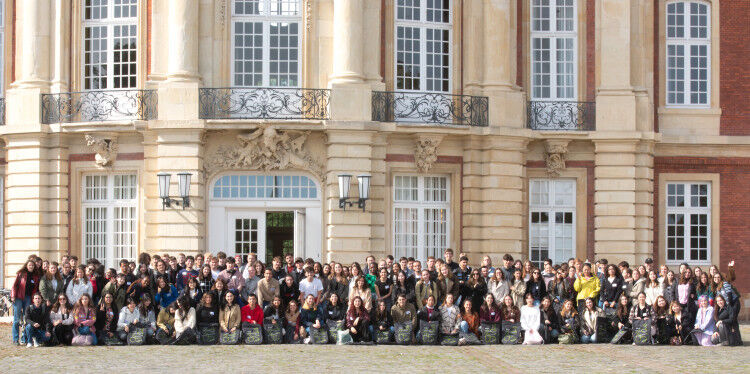 Zu sehen ist eine große Gruppe internationaler Studierender vor dem Haupteingang des Schlosses. Zum Wintersemester 2025 begrüßte die Universität Münster jetzt 150 neue internationale Studierende. Rund ums Schloss informierte das International Office die Studierenden der zahlreichen Partnerhochschulen vor allem über die Universität und das Leben in der Stadt. In den kommenden Tagen laden unter anderem eine Stadtrallye, eine Willkommensparty, eine Fahrt auf der MS Günther und eine Kneipentour dazu ein, die Universität und den Studienort besser kennenzulernen. Für das ,,Buddy-Programm" haben sich über 140 Studierende aus höheren Semestern gemeldet, die den neuen internationalen Studierenden in den ersten Wochen mit Rat und Tat zur Seite stehen.