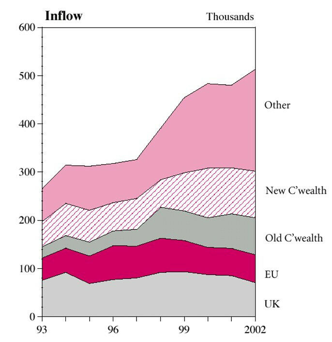 The internationally renowned social anthropologist coined the term "superdiversity" in 2007, which has since become firmly established in the social sciences. "Societies have always been diverse", says Steven Vertovec, "but superdiversity refers to a diversity that goes far beyond the previous level and is highly complex". An important impetus for the development of the concept was provided by a report of the Home Office with a graphic showing the influx of migrants into the UK from 1993 to 2002, sorted into the categories UK, EU, Commonwealth, Other. From 1997 onwards, the "Other" category grew massively. Steven Vertovec saw this as an indication that the concept of diversity in British society would have to be rethought.Original graphic (right): Total international migration to UK by country of birth, 1993-2002 / Source: British Home Office