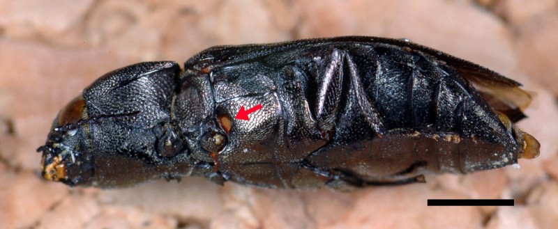 Der rote Pfeil weist auf das Infrarotorgan hin, das aus großer Entfernung Wärmestrahlung wahrnehmen kann. (c) Foto: Helmut Schmitz/Uni Bonn