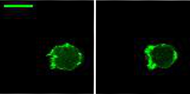 Durch äußere chemische Reize gerät das Zytoskelett der Amöbe Dictyostelium discoideum in Bewegung: Im 20-Sekunden-Takt wird das Strukturprotein Aktin im Innern ab- und an der Innenseite der Zellmembran aufgebaut. Im linken Bild befindet sich noch recht viel Aktin (grüne Färbung) im Innern der Zelle. Einige Sekunden später (rechtes Bild) hat sich die Aktinstruktur zum Rand hin verlagert. [weniger]