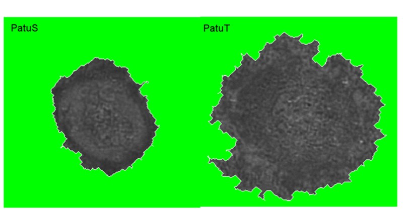 Je ausgefranster, desto bösartiger: Eine Tumorzelle lässt sich an ihrer fraktalen Geometrie, genauer an ihrem Fraktalisierungsgrad, erkennen. Dass die rechte Zelle einen höheren Fraktalisierungsgrad aufweist als die linke, zeigt ihre höhere Aggressivität. [weniger]