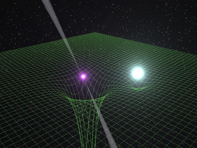 Beobachtungen am massereichsten Neutronenstern bestätigen Vorhersagen der Allgemeinen Relativitätstheorie. Ein Team unter der Leitung von Wissenschaftlern aus dem Bonner Max-Planck-Institut für Radioastronomie hat mit mehreren großen Radioantennen und optischen Teleskopen einen Pulsar und seinen Begleiter, einen Weißen Zwerg, detailliert untersucht. Die Beobachtungen zeigen ein Doppelsternsystem mit ungewöhnlichen Eigenschaften: Der Pulsar wiegt doppelt so viel wie die Sonne und ist damit der massereichste bisher bekannte Neutronenstern. In Verbindung mit der sehr kurzen Umlaufperiode von nur 2,5 Stunden ergeben sich unter anderem neue Erkenntnisse über die Aussendung von Gravitationswellen. So bildet das System einen Modellfall für die Untersuchung der Allgemeinen Relativitätstheorie unter extremen Bedingungen. Das Doppelsternsystem PSR J0348+0432: Der Pulsar (links, dargestellt mit stark gebündelter Radiostrahlung in zwei entgegengesetzten Richtungen) ist sehr kompakt und führt zu einer starken Deformation der Raumzeit, verdeutlicht durch das grüne Koordinatengitter. Der Weiße Zwerg als Begleitstern mit geringerer Masse ist rechts davon in hellblauer Farbe dargestellt.