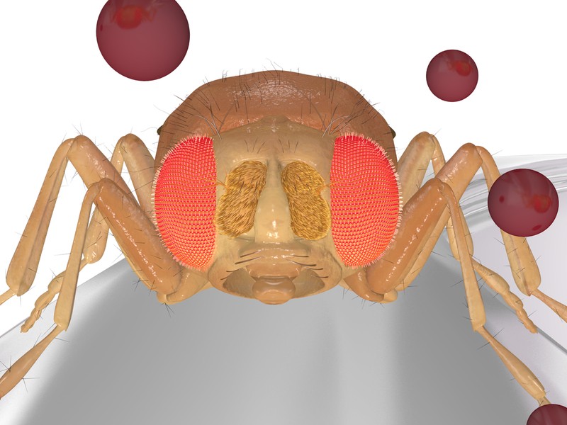 Dank ihrer hochentwickelten Antennen können sich Insekten an kleinsten Geruchskonzentrationen orientieren. Perfekt ausgestattet mit verschiedenen Geruchsrezeptoren finden sie Nahrung, optimale Eiablageplätze oder Geschlechtspartner. Wissenschaftler des Max-Planck-Instituts für chemische Ökologie, Jena, haben jetzt erstmals experimentell und mithilfe von Mutanten bestätigt, dass das enorme Geruchsvermögen von Insekten - sie erkennen wenige tausend Moleküle pro Milliliter Luft, während Menschen Hunderte von Millionen Duftmoleküle zur Geruchswahrnehmung benötigen - auf einer Selbstregulation ihrer Duftrezeptoren beruht: Geringste Mengen von Duftmolekülen unterhalb der Reaktionsschwelle bewirken die Sensibilisierung bestimmter Duftrezeptoren, und das Auftreffen weiterer Moleküle kurz danach löst die Öffnung eines Ionenkanals aus, was Reaktion und Flugverhalten der Fliege steuert. Dies bedeutet, dass eine Geruchsstimulierung unterhalb der Reizschwelle die Sensibilität des Rezeptors erhöht. Kommt innerhalb einer bestimmten Zeitspanne ein zweiter Geruchsimpuls hinzu, wird eine neuronale Reaktion ausgelöst. Die Antennen der Fruchtfliege Drosophila melanogaster, hier in dunkelgelb schematisch dargestellt. Dunkelrot: Duftmoleküle. Max-Planck-Institut für chemische Ökologie/Wicher Es ist erstaunlich, wie viele Fruchtfliegen ( Drosophila melanogaster ) zu einem angefaulten Apfel finden können.