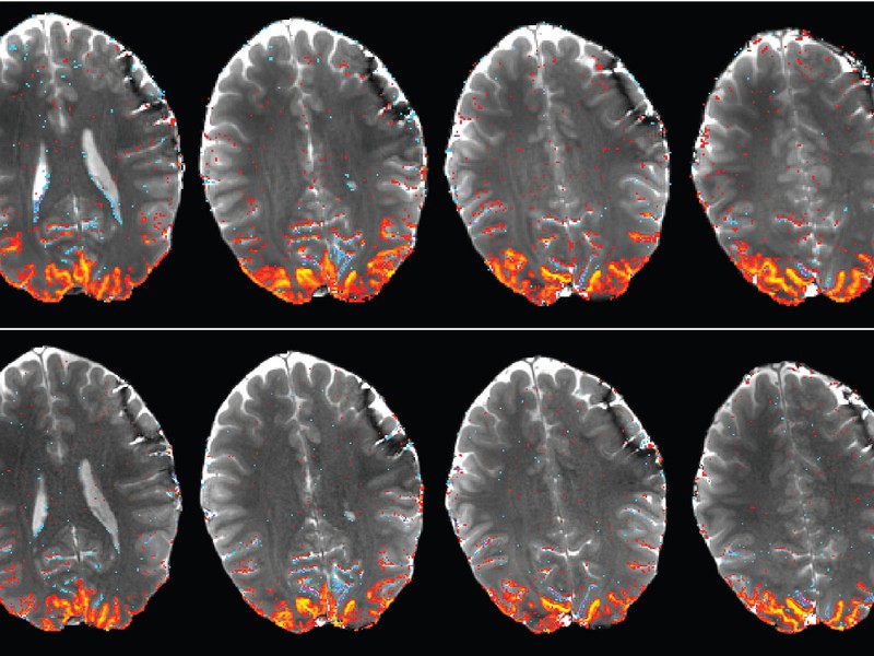 Verschiedene MRT-Schnittebenen durch eine aktivierte Sehrinde: Die bei sehr hohe
