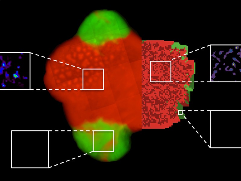 Übereinstimmung zwischen Experiment (Bakterienkolonie und Aminosäure-messungen mit Hilfe bildgebender Massenspektrometrie, links) und Computermodell (rechts): Kooperierende Bakterien sind rot dargestellt, nicht kooperierende Bakterien grün. Die opportunistischen Bakterien können lediglich am Rand von kooperierenden Bakterienkolonien existieren. In den kleinen Fenstern sind die Ergebnisse der Aminosäuremessungen zu sehen, deren Konzentrationen in der Umgebung kooperativer Bakterien hoch ist (oben). Im Umfeld opportunistischer Bakterien hingegen sind Aminosäuren nicht nachweisbar (unten). [weniger]