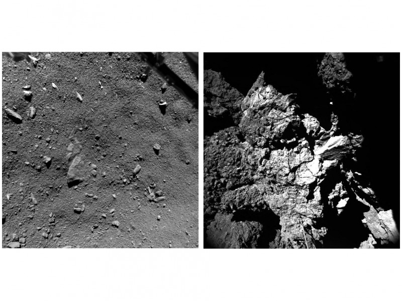 Eine weiche und eine harte Landung: Die linke Aufnahme der Landestelle Agilkia entstand mit Hilfe der ROLIS-Kamera aus einer Entfernung von neun Metern, kurz bevor Philae auf der Kometenoberfläche aufsetzte. Die rechte Aufnahme des endgültigen Landeplatzes Abydos machte CIVA-Kamera am 13. November 2014. [weniger]