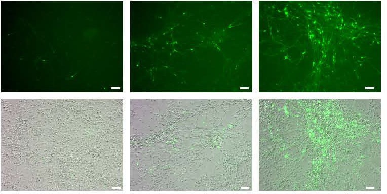 Max-Planck-Forscher beobachten Stammzellen im lebenden Gehirn. Auf Stammzellen ruhen die Hoffnungen vieler Mediziner. Sie könnten beispielsweise abgestorbene Nervenzellen nach einem Schlaganfall ersetzen. Bislang war es jedoch nicht möglich, Stammzellen live dabei zu beobachten, wie sie sich zu voll funktionsfähigen Nervenzellen entwickeln. Jetzt haben Forscher am Max-Planck-Institut für Stoffwechselforschung in Köln ein neuartiges Verfahren entwickelt, einen solchen Vorgang im lebenden Gehirn zu beobachten. Sie können damit verfolgen, wie sich menschliche Stammzellen nach der Transplantation in die Hirnrinde von Mäusen zu reifen Nervenzellen entwickeln und funktionstüchtig werden. Aus Stammzellen werden Nervenzellen: Im Verlauf von drei Wochen wandeln sich immer mehr Stammzellen in noch unreife Nervenzellen um (grün).
