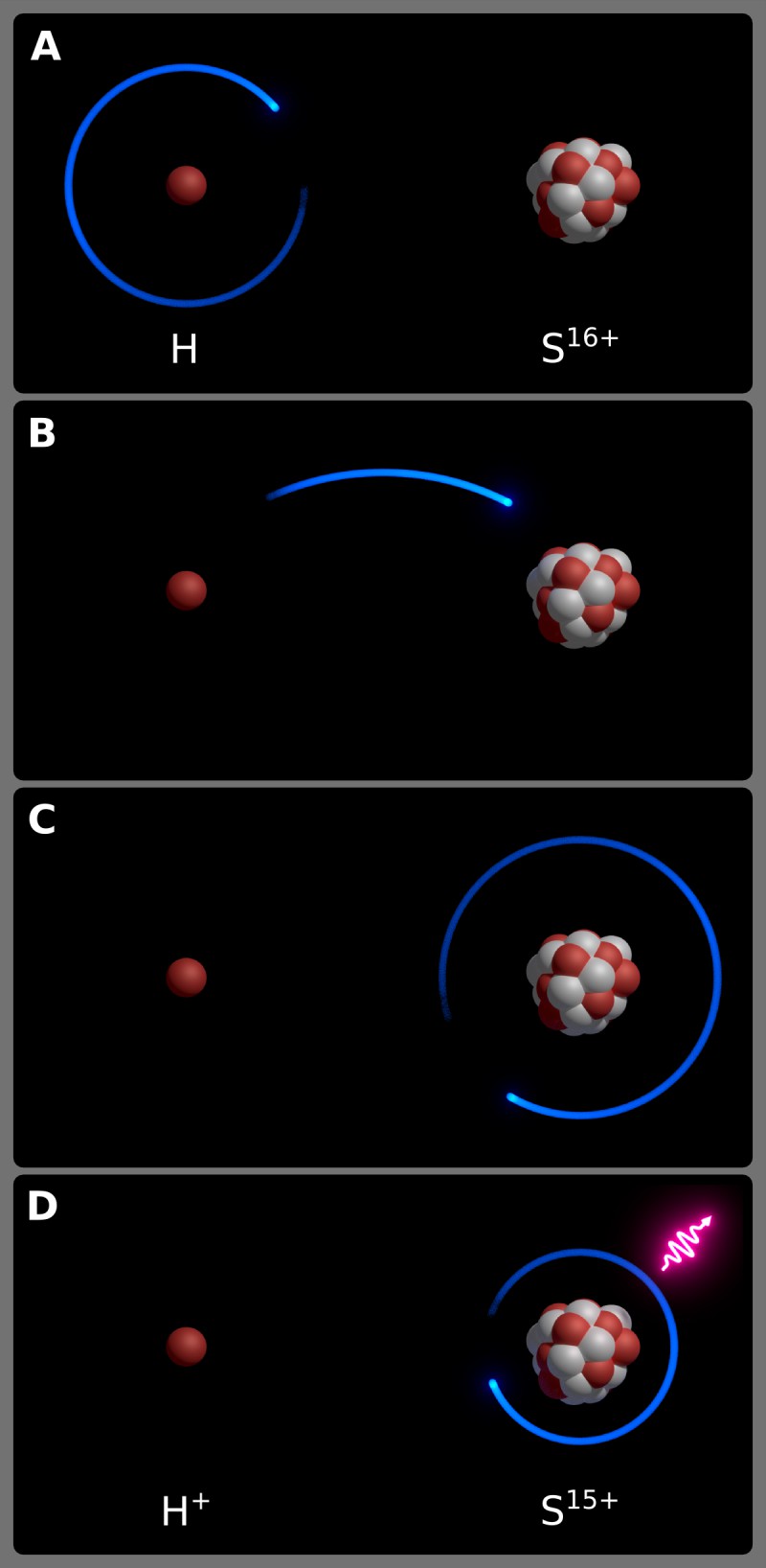 Ein mysteriöses Röntgensignal dürfte von Schwefel-Ionen stammen, die Elektronen einfangen. Ein mysteriöses Röntgensignal von Galaxienclustern hat unter Astronomen kürzlich für Aufregung gesorgt: Stammt es etwa von der Dunklen Materie, die rund 80 Prozent der Materie im Universum ausmacht, derer die Wissenschaftler bislang aber nicht habhaft werden? Um zur Beantwortung dieser Frage beizutragen, prüften Physiker des Heidelberger Max-Planck-Instituts für Kernphysik im Labor eine alternative Erklärung. Demnach muss die Suche nach der schwer fassbaren Materieform weitergehen. Denn das rätselhafte Röntgensignal könnte von hochgeladenen Schwefel-Ionen stammen, die Elektronen von Wasserstoffatomen einfangen. Ladungsaustausch statt Dunkler Materie: Ein bislang nicht erklärbares Röntgensignal aus Galaxienclustern könnte entstehen, wenn hochgeladener Schwefel ein Elektron aufnimmt. Dabei nähert sich ein Schwefelkern (S16+) einem Wasserstoffatom (A) und zieht das Elektron an(B), das in einem hohen Energieniveau von S15+ landet (C) und unter Abgabe von Röntgenlicht in den Grundzustand übergeht (D). Vor rund zwei Jahren funkte der Röntgensatellit XMM-Newton Daten zur Erde, die bei Astrophysikern große Hoffnungen weckten.