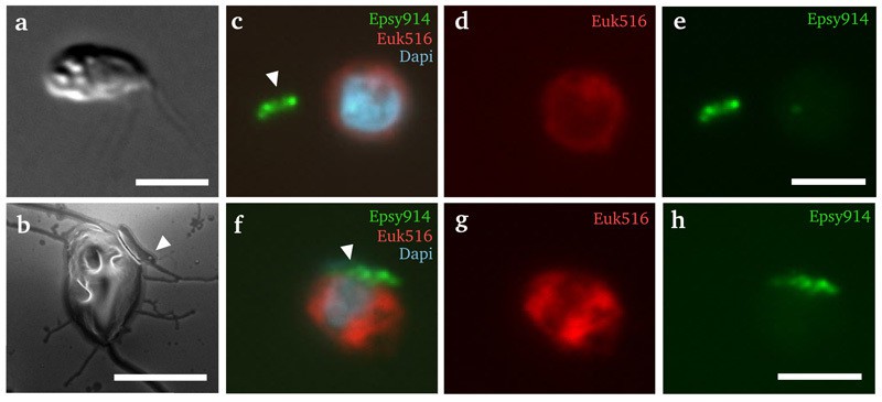 Bakterien sind möglicherweise schon früh in der Evolution Symbiosen mit ursprünglichen Einzellern eingegangen. Tag ein, Tag aus, auf engstem Raum mit dem größten Feind. Klingt unvorstellbar? In der Welt der Mikroben ist dies seit Jahrmilliarden Alltag. Diese Nähe kann zu ungewöhnlichen Partnerschaften führen, wie eine Studie von Forschern des Max-Planck-Instituts für Marine Mikrobiologie und der Universität Calgary zeigt. Lenisia limosa ist ein einzelliger Räuber, der sich mithilfe zweier Geißeln langsam taumelnd fortbewegen kann (Bilder a und b). Bilder c-h: Bakterienzellen der Gattung Arcobacter (grün) auf der Oberfläche von L. limosa (rot, blau: Zellkern ). (Maßstabsbalken = 5 Mikrometer) Möchte man wissen, wie unsere urzeitlichen Vorfahren aussahen, hilft ein Blick durchs Mikroskop. Mit etwas Glück entdeckt man sie: kleine, einzellige Eukaryoten - auch Protisten genannt. Protisten sind direkte Verwandte von Tieren, Pflanzen und Pilzen. Doch diese Einzeller haben sich im Laufe der Evolution kaum weiterentwickelt. Viele Protisten machen noch heute genau das, was schon ihre Vorfahren vor Urzeiten taten: Sie jagen und verspeisen andere Mikroorganismen. Zu diesen räuberischen Protisten zählen beispielsweise die Breviaten. Diese Gruppe tauchte das erste mal vor etwa einer Milliarde Jahren auf - zu einer Zeit, in der in den Tiefen des Ozeans noch kaum Sauerstoff vorhanden war. Als Anpassung an den Sauerstoffmangel nutzen Breviaten einen recht einfachen Stoffwechsel: die sogenannte Fermentation, eine Form der Gärung. Dieser Prozess liefert deutlich weniger Energie als beispielsweise die bakterielle Nitratatmung. Wäre es da nicht sinnvoll für die Breviaten, mit Bakterien zusammenzuarbeiten um ihren Stoffwechsel effizienter zu machen?