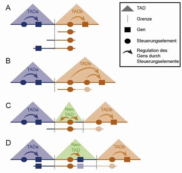 A) Schematische Darstellung zweier TADs im gesunden Genom. B) Die Duplikation befindet sich vollständig innerhalb einer TAD (Intra-TAD), die übergeordnete Struktur des Genoms wird nicht beeinflusst. Innerhalb der TAD kommt es zu einer Fehlregulation des betroffenen Gens. C) Die Duplikation betrifft auch die Grenze zwischen zwei TADs (Inter-TAD), dadurch entsteht eine neue TAD (Neo-TAD). Diese enthält nur Steuerungselemente, aber kein Gen, daher ergeben sich keinerlei Auswirkungen auf den Organismus. D) Die Duplikation betrifft die Grenze zwischen zwei TADs (Inter-TAD) sowie ein Gen der benachbarten TAD. Die entstandene Neo-TAD enthält die Steuerungsmechanismen der orangenen TAD und ein Gen aus der blauen TAD, das daher fehlreguliert wird. [weniger]
