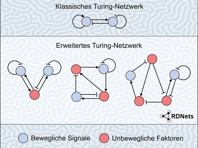 Wissenschaftler aus Tübingen entwickeln Software zur Simulation von Netzwerken, die den Ablauf der Embryonalentwicklung steuern. Wenn neues Leben entsteht, wird aus einem winzigen Haufen identischer Zellen ein ausgewachsener Organismus mit verschiedenen Körperteilen. Vor 60 Jahren schlug Alan Turing die Theorie vor, dass solche Musterbildungsvorgänge während der Embryogenese durch die Ausbreitung zweier unterschiedlicher Signalmoleküle in den sich entwickelnden Geweben gesteuert werden. Wissenschaftler vom Friedrich-Miescher-Laboratorium der Max-Planck-Gesellschaft in Tübingen haben jetzt eine Software entwickelt, die mittels eines mathematischen Algorithmus systematisch realistische Musterbildungssysteme mit mehr als zwei Molekülen analysieren kann. Mit der Software haben die Forscher Musterbildungsprozesse während der Embryonalentwicklung untersucht. Sie können nun neue Systeme für den Einsatz in der Biotechnologie und regenerativen Medizin aufzeigen. Modell eines klassischen Turing-Netzwerks im Vergleich zu erweiterten Turing-Netzwerken, die mit der Software RDNets untersucht werden können.