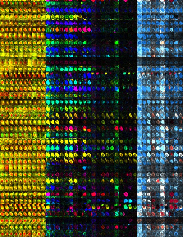 Aktive Nervenzellen der visuellen Großhirnrinde der Maus bei veränderten Sinneseindrücken. Die Bilder einer Reihe zeigen jeweils eine einzige Nervenzelle. Jedes Teilbild eines Farbblocks entspricht einer Untersuchung (insgesamt 10) über 2 Monate hinweg: Die Teilbilder des linken Blocks (gelb/rot) zeigen die Struktur einer Nervenzelle. In den mittleren beiden Blöcken entsprechen die Farben der Stärke der Antwort einer Zelle auf Sehreize unterschiedlicher Orientierung. Der zweite Block repräsentiert das Auge, das der untersuchten Hirnhälfte gegenüber liegt (hier: das linke Auge). Der dritte Block entspricht dem rechten Auge. Der rechte Block (blau/rot) stellt die relative Antwortstärke der Zellen bei der Stimulation des dominanten linken (kontralateral) relativ zum rechten Auge (ipsilateral) dar (kontralaterale: blau, ipsilaterale: rot, binokulare Dominanz: weiß). Nach Verschluss des linken kontralateralen Auges nach der 3. und 7. Untersuchung reagieren einige Zellen auf das offengebliebene Auge stärker und erscheinen dadurch rot. [weniger]