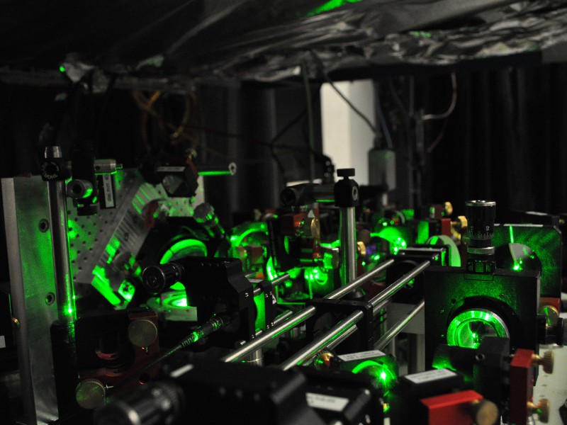 Ausschnitt aus dem optischen System, mit dem die Wissenschaftler Atome einfangen und verändern. Mit der Anordnung von Spiegeln und optischen Linsen kann eine grosse Zahl Laserstrahlen in die Atome gebracht werden. (Bild: Jean-Philippe Brantut / ETH Zürich)
