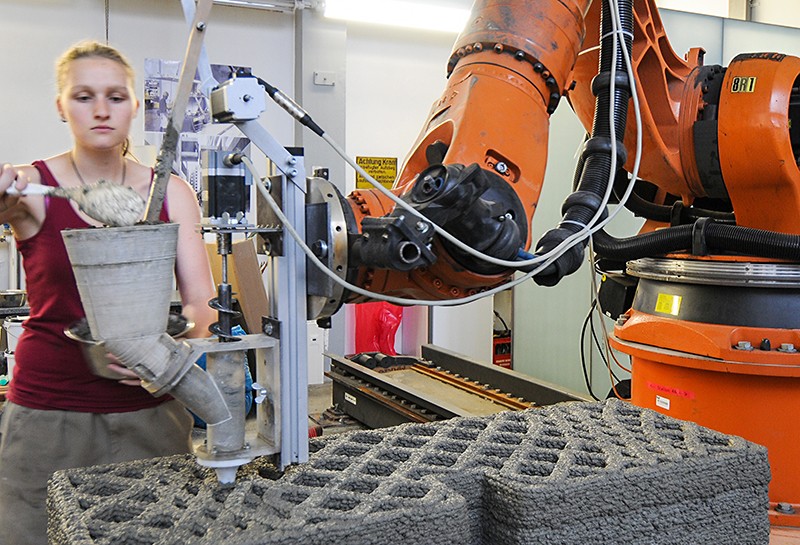 An der Versuchsanlage für additive Fertigung wird durch Extrusion von Holzleichtbeton ein multifunktionales Wandelement hergestellt. Bachelor-Studentin Bettina Saile befüllt den Versuchsextruder mit Frischbeton. (Foto: K. Henke / TUM)