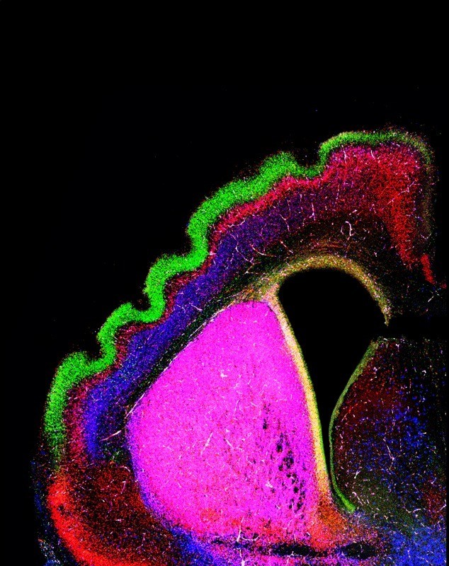 Ohne Adhäsions-Moleküle der FLRT-Familie bildet die normalerweise glatte Hirnrinde der Maus Falten aus, die in Aufbau und Struktur dem menschlichen Gehirn entsprechen. Die Nervenzellen im Bild sind nach der zugehörigen Hirnschicht farblich markiert - grün für die äußere und rot für tieferliegende Schichten; andere Zellen erscheinen blau. [weniger]
