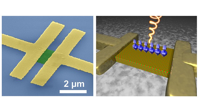 Foto: UHH/Klinke Abb. links: Kolorierte elektronenmikroskopische Aufnahme eines zweidimensionalen Bleisulfid-Nanoplättchens (Grün), das mit zwei Gold-Elektroden kontaktiert ist. Abb. rechts: Schema des Phänomens: Zirkular-polarisiertes Licht, das auf das Nanoplättchen trifft, richtet die Elektronen in ihrem Spin aus, treibt sie zu den Kontakten und erzeugt somit Strom.