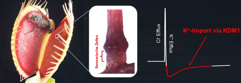 Offene Falle von Dionaea muscipula mit einer Ameise als Beute. In der Mitte die Basis eines Sinneshaars, in dessen sensorischen Zellen Aktionspotentiale ausgelöst werden. Der Sinneshaar-spezifische Ionenkanal KDM1 wird für den Re-Import von Kaliumionen in die sensorischen Zellen benötigt, so dass ein erneutes Aktionspotential entstehen kann. Ines Kreuzer, Sönke Scherzer / Universität Würzburg) - Das Display eines Smartphones reagiert auf Fingerdruck. Die fleischfressende Venusfliegenfalle dagegen bemerkt sogar, wenn ein Leichtgewicht wie eine Fliege auf ihr landet. Spezielle Gene machen das möglich. Alle Pflanzenzellen lassen sich durch Berührungen oder Verletzungen zu Reaktionen bewegen.