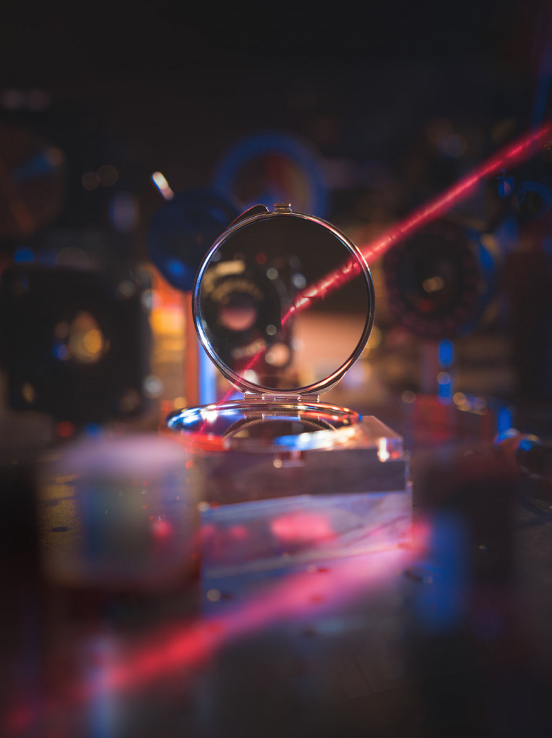 Ein Spiegel aus der Quantenwelt: Das Atomensemble, das dank seines kollektiven Verhaltens Licht sehr gut reflektiert, lässt sich anders als einzelne Atome direkt mit einem Laserstrahl beleuchten. Das wird hier mit einem Spiegel, der in der Umgebung eines optischen Experiments steht und Laserlicht reflektiert, symbolisiert. Der eigentliche Spiegel der Garchinger Physiker ist mit bloßem Auge nicht erkennbar.