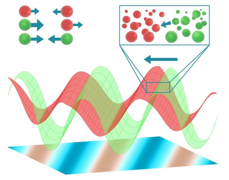 Partikel zweier Arten (rot und grün) interagieren miteinander. Während Partikel desselben Typs zwangsläufig reziproke Anziehung oder Abstoßung erfahren, können Partikel verschiedener Typen nicht-reziprok interagieren. Hier jagen die grünen Partikel den roten Partikeln hinterher. In großem Umfang jagen die hochverdichten Bänder der grünen Partikel den Bändern der roten Partikel nach, was zur Entstehung von Ordnung und Bewegung im System führt.