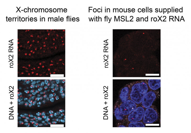 Das Team von Asifa Akhtar konnte die Miniatur-Fliegen-X-Chromosomen nachbilden, indem sie die Mauszellen mit MSL2- und roX-RNA der Fliege anreicherten. Diese wurden sichtbar gemacht (rechts) und weisen Ähnlichkeit mit den Bereichen des X-Chromosoms (durch den MSL-Komplex bedeckt) auf, die während der Dosiskompensation unter natürlichen Bedingungen auch bei männlichen Fliegen beobachtet werden (links).