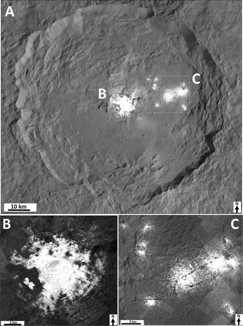 Diese Bildmosaike des Occator-Kraters wurden zusammengesetzt aus vielen Einzelbildern der Dawn Framing Camera, die aus einer Entfernung von 35 Kilometern aufgenommen wurden. Innerhalb des Kraters, der einen Durchmesser von 92 Kilometern hat (A), finden sich zwei Bereiche mit hellen Ablagerungen. Die Ablagerungen im Zentrum des Kraters, genannt Cerealia Facula (B), messen nur einige Kilometer im Durchmesser. In ihrer Mitte wölbt sich eine Kuppe nach oben. Die Ablagerungen im Nordosten des Kraters tragen den Namen Vinalia Faculae (C).