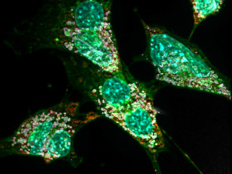 Gefährliches Fett: Deoxysphingolipide (grün) stören nicht nur die Arbeit der Mitochondrien (rot), sondern auch die Zellteilung. Manche von ihnen haben daher zwei Kerne (türkis).