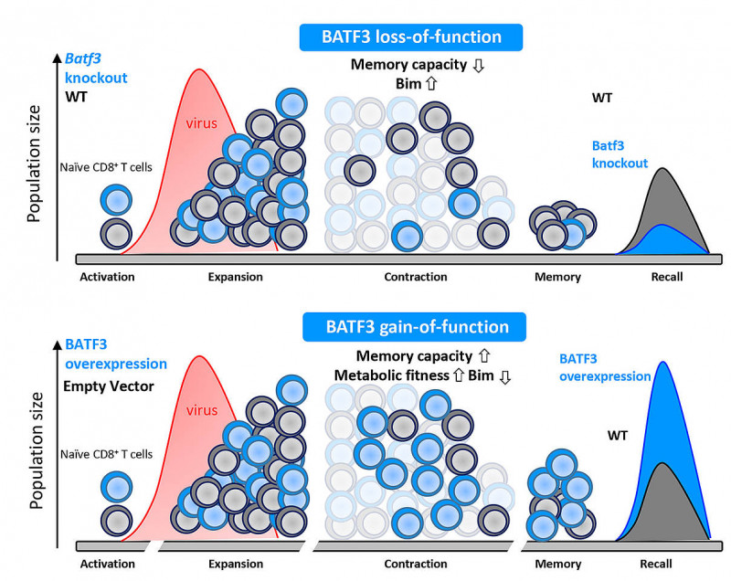 Schematische Darstellung der Funktion von BATF3. In der oberen Hälfte sind die physiologische Funktion und die Konsequenzen zu sehen, wenn dieser Faktor fehlt (knockout). Die untere Hälfte zeigt die Konsequenzen bei einer unnatürlich vermehrten Expression mit der daraus resultierenden therapeutischen Anwendbarkeit. Marco Ataide) - Nach einer Infektion merkt sich das Immunsystem den Krankheitserreger und kann deshalb bei einer erneuten Infektion schnell reagieren. Wissenschaftler der Uni Würzburg haben jetzt neue Details dieses Vorgangs entschlüsselt. Schematische Darstellung der Funktion von BATF3. In der oberen Hälfte sind die physiologische Funktion und die Konsequenzen zu sehen, wenn dieser Faktor fehlt (knockout).