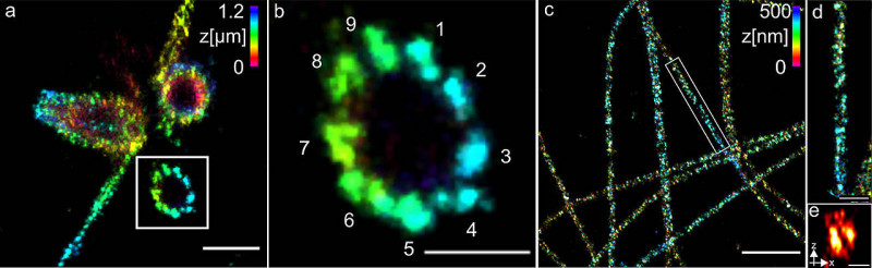 (a) Dreidimensionale Ex-dSTORM von 3,2-fach expandierten Zentriolen. Messbalken ein Mikrometer. (b) Der vergrößerte Ausschnitt aus (a) zeigt die neunfache Symmetrie der Prozentriole. Messbalken 500 Nanometer. (c) Dreidimensionale Ex-dSTORM von 3,1-fach expandierten Tubulinfilamenten. Messbalken zwei Mikrometer. (d) Die Vergrößerung aus (c) zeigt ein Tubulinfilament; Messbalken 500 Nanometer. (e) Der Querschnitt eines Tubulinfilaments zeigt dessen hohle Struktur. Messbalken 200 Nanometer. ( Team Markus Sauer / Universität Würzburg)