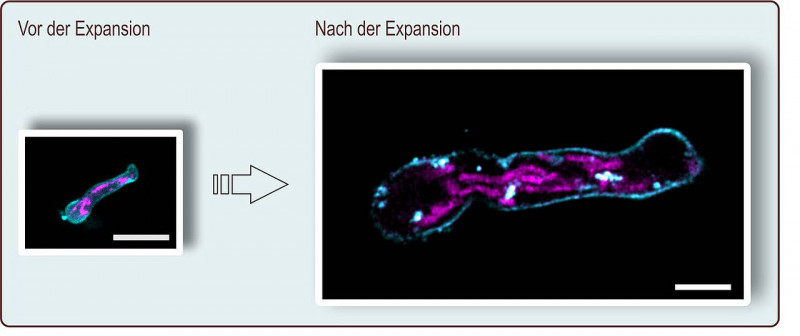 Bei der Expansionsmikroskopie wird das Präparat um mehr als das Vierfache vergrößert. Hier ist ein Keimschlauch von Aspergillus fumigatus vor und nach der Expansion zu sehen; der Maßstab entspricht zehn Mikrometern. Gefärbt wurden die Plasmamembran (türkis) und die Mitochondrien (pink). ( Ulrich Terpitz / Universität Würzburg)