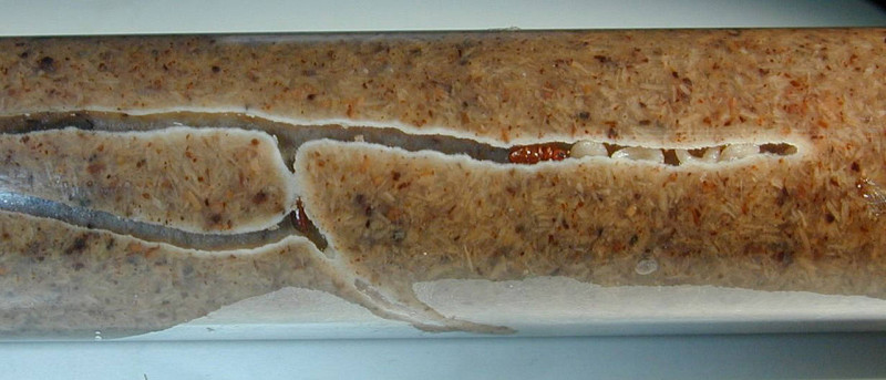 Brutsystem des Zuckerrohr-Ambrosiakäfers, Xyleborus affinis, in einem Glasröhrchen mit künstlichem Nährmedium. Am Ende eines Tunnels erkennt man eine Käfermutter mit Larven. Die Gangwände sind mit einer hellen Schicht aus Nahrungs- und Unkrautpilzen bewachsen. ( Peter Biedermann / Universität Würzburg)