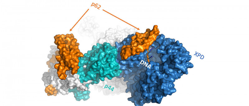 Die Abbildung zeigt Untereinheiten des Reparaturkomplexes der NER. Durch das Zusammenspiel von p62, p44 und XPD (orange/türkis/blau) werden Schädigungen in der DNA erkannt und können repariert werden. (Grafik: RVZ)