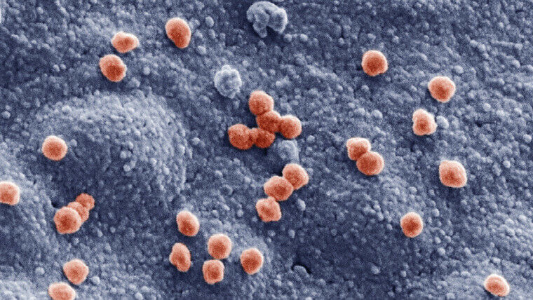 Nachkolorierte elektronenmikroskopische Aufnahme von SARS-CoV-2 Viren auf einer Lungenzelle Foto: Sandor Nietzsche/Elektronenmikroskopisches Zentrum/UKJ - Forschungsteam am Universitätsklinikum hat die SARS-CoV-2-Viruslast in einer Vielzahl von Organen und Geweben gemessen und die Gewebeschäden im Zusammenhang mit der Verteilung des Virus untersucht. In der seit über einem Jahr währenden Pandemie wurden bereits über 100 Millionen SARS-CoV-2-Infektionen weltweit registriert. Vieles konnte in der biomedizinischen und klinischen Erforschung von COVID-19 schon erreicht werden, jedoch sind weiterhin noch wesentliche Krankheitsmechanismen unverstanden. Ein Forschungsteam aus Virologie und Mikrobiologie, Rechtsmedizin und Pathologie sowie Intensivmedizin und Elektronenmikrospie am Universitätsklinikum Jena untersuchte die Körper von elf Patienten, die an COVID-19 verstorben sind. Sie erfassten die SARS-CoV-2-Viruslast in einer Vielzahl von Organen und Geweben und brachten die Verteilung des Virus in Zusammenhang mit den festgestellten Gewebeschäden. Ihre Ergebnisse veröffentlichten sie jetzt im Onlinejournal eLife. Die Studie wurde von der Carl-Zeiss-Stiftung gefördert.