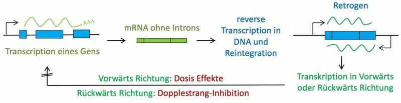 Funktionsweise eines Retrogens. MPI f. Evolutionsbiologie - MRNA-Moleküle von Retrogenen werden wieder in DNA umgewandelt und ins Erbgut eingebaut Eine neue Studie von Forschenden des Max-Planck-Instituts für Evolutionsbiologie in Plön und der chinesischen Akademie der Wissenschaften in Peking zeigt, dass die potentielle genetische Belastung durch Mutationen, die aus Retrogenen entstehen, deutlich größer ist als bisher angenommen. Die genetische Information ist in der DNA gespeichert. Von dort wird sie als mRNA abgeschrieben und dann in Proteine übersetzt. Man weiß aber schon seit langem, dass mRNA auch wieder in DNA umgeschrieben und zurück ins Genom integrieren kann. Man spricht in solchen Fällen von Retrogenen. Ein Team des Max-Planck-Instituts für Evolutionsbiologie in Plön und des Zoologischen Instituts der chinesischen Akademie der Wissenschaften in Peking berichtet jetzt, dass dieser Prozess bisher um mindestens einen Faktor tausend unterschätzt wurde und zudem einen wesentlichen neuen Mutationsmechanismus darstellt.