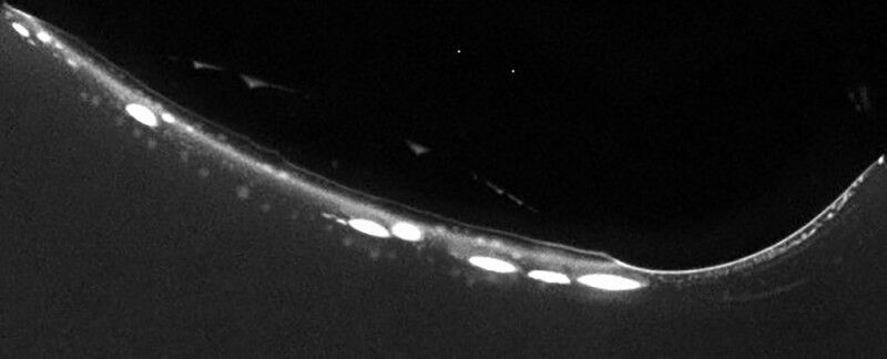 Fluoreszenzmikroskopische Aufnahme von Protozellen in Kontakt mit einer Gasblase