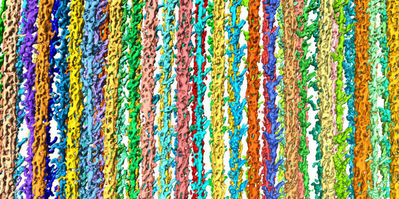 3D-Rekonstruktion des Sarkomers. Farbige Stränge sind einzelne Filamente. MPI f. molekulare Physiologie - Forschende des Max-Planck-Instituts in Dortmund decken mithilfe der Kryoelektronentomografie ungeahnte molekulare Details des Sarkomers auf Ein internationales Team unter der Leitung von Stefan Raunser, Direktor am Max-Planck-Institut für molekulare Physiologie in Dortmund, in Zusammenarbeit mit Mathias Gautel vom King's College in London hat mithilfe der Kryoelektronentomografie das erste hochauflösende 3D-Bild des Sarkomers erstellt, der kontraktilen Grundeinheit von Skelettund Herzmuskelzellen. Die Fähigkeit der Kryoelektronentomografie, hochaufgelöste Strukturen direkt in gefrorenen Muskelzellen sichtbar zu machen, legt eine wichtige Grundlage für die zukünftige medizinische Behandlungen von Muskelkrankheiten und wird zu einem besseren Verständnis des Alterungsprozesses beitragen. Sarkomere sind die kleinsten, sich wiederholenden, funktionellen Baueinheiten der Muskelfibrillen. Hunderte dieser parallel angeordneten Fibrillen bilden eine Muskelfaser. Innerhalb der Sarkomere interagieren Filamente der Proteine Myosin und Aktin miteinander und erzeugen dadurch die Kontraktion und Entspannung des Muskels.