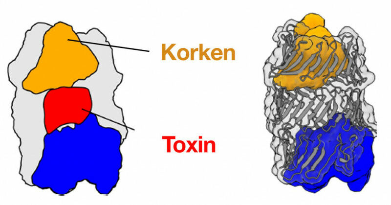 3D-Struktur des RhsA-Effektors von Pseudomonas protegens. RhsA kapselt seine toxische Effektordomäne ein (rot). Der Kokon wird durch den Korken (gelb) verschlossen. Die Spaltung im Inneren von RhsA erfolgt über die blaue Autoproteolyse-Domäne.
