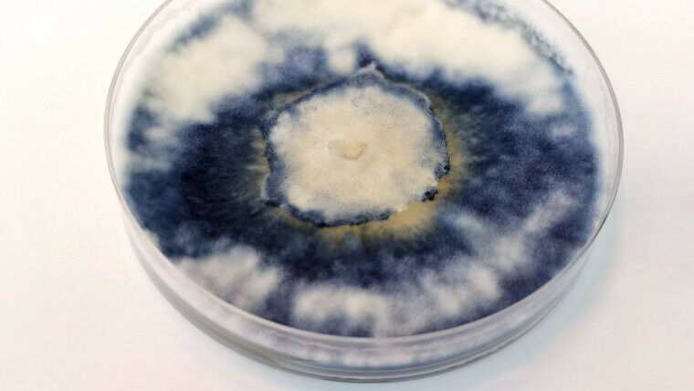 Belichtete Laborkultur des blauen Rindenpilzes, die die typische kobaltblaue Farbe zeigt. Foto: Stefanie Lawrinowitz