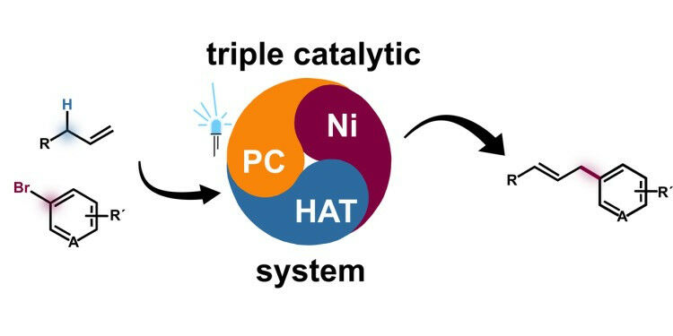 Die neue Methode zur Arylierung unaktivierter Alkene beruht auf einem speziellen Katalysatorsystem - auf einem sogenannten ternären Nickel(Ni)-Wasserstoffatomtransfer(HAT)-Photodox(PC)-Synergiesystem (schematisch in der Mitte dargestellt). Linke Seite: Strukturformeln einer Arylgruppe ( oben ) und eines unaktivierten Alkens, rechte Seite: Strukturformel eines arylierten Alkens nach der Synthese. AG Glorius - WWU Münster Für die organische Synthese, also für die Herstellung von Kohlenstoff-Verbindungen, ist die Entwicklung von Syntheseverfahren von Bedeutung, durch die sich das gewünschte Produkt in guter Ausbeute gewinnen lässt. Gleichzeitig sollen die Verfahren nachhaltig sein: Sie sollen beispielsweise umweltfreundliche und leicht verfügbare Reagenzien verwenden, wenig Abfall erzeugen und wenig Energie verbrauchen. Neue Syntheseverfahren, die diese Kriterien erfüllen, können als Sprungbrett für Innovationen dienen - von der medizinischen Chemie bis zur Materialwissenschaft. Ein Beispiel sind sogenannte Übergangsmetall-katalysierte Kreuzkupplungsreaktionen. Auf diesem Gebiet hat ein Forschungsteam unter der Leitung der Chemieprofessoren Frank Glorius (Universität Münster) und Kendall N. Houk (University of California, Los Angeles) jetzt ein Problem gelöst, das seit Jahren als Herausforderung galt: die katalytische Kohlenstoff-Wasserstoff- (C'H-) Arylierung von unaktivierten Alkenen.