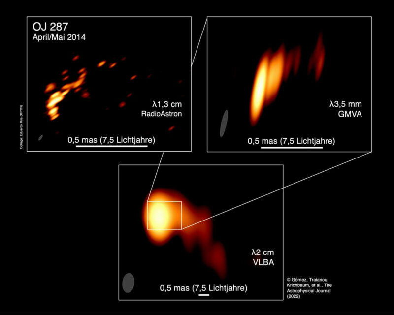 Nahe am schwarzen Loch: Darstellung des gekrümmten Jets in der aktiven Galaxie OJ 287 auf drei Radiobildern unterschiedlicher Wellenlänge und Auflösung. Oben links: Radiokarte bei 1,3 Zentimeter Wellenlänge mit ,,RadioAstron’, einem globalen Netzwerk von Radioteleskopen zusammen mit dem Weltraum-Radioteleskop Spektr-R. Oben rechts: Radiokarte bei 3,5 Millimeter Wellenlänge mit dem ,,Global mm-VLBI Array’. Unten: Radiokarte bei 2 Zentimeter Wellenlänge mit dem ,,Very Long Baseline Array’, einem Netzwerk aus zehn Radioteleskopen in den USA. Die Ellipsen unten links geben die jeweilige Bildauflösung an, die Winkel- und Längenskala wird durch einen horizontalen weißen Balken am unteren Rand angezeigt. Das Bild oben links hat eine rekordverdächtige Auflösung von etwa 12 Mikrobogensekunden, die durch Einbindung des Weltraum-Radioteleskops mit seiner Entfernung von bis zu 15 Erddurchmessern erreicht wird.