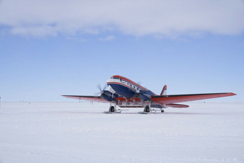 Das AWI-Forschungsflugzeug kurz nach der Landung am Camp auf dem Nord-Ost-Grönland-Eisstrom. Die Radarantenne ist unter der Flugzeugkabine angebracht. Der Flug mit nur einer Antenne erhöht die Reichweite des Flugzeuges, was die langen Messflüge ermöglichte, die für die in der Veröffentlichung verwendeten Daten nötig waren.