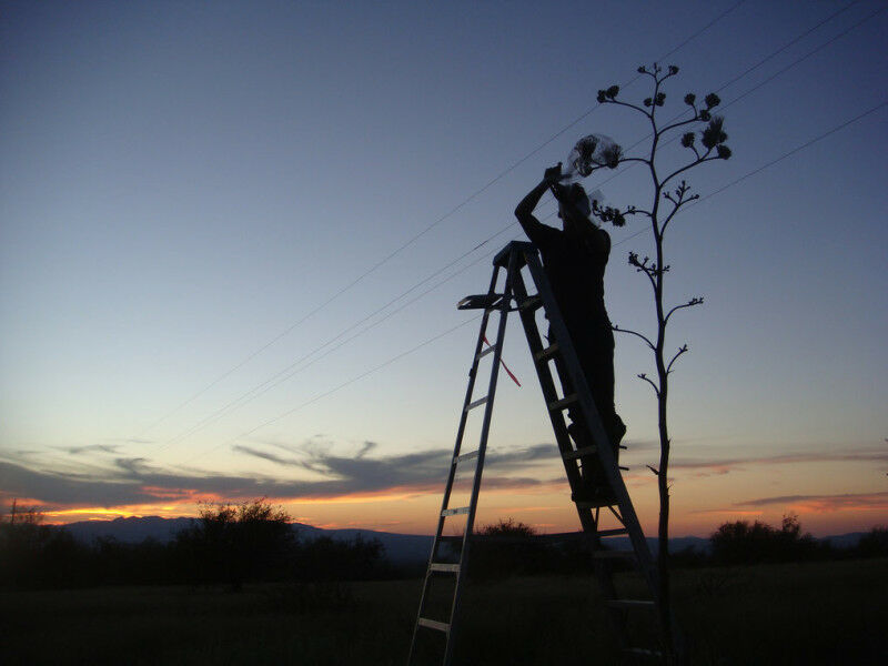 Um den nächtlichen Duft der Agavenblüten einzufangen, wurden bei Sonnenuntergang einzelne Dolden an dem bis zu fünf Meter hohen Blütenstand in Folienbeutel eingeschlossen und mit einem mobilen Duftsammelsystem verbunden. © Sonja Bisch-Knaden Um den nächtlichen Duft der Agavenblüten einzufangen, wurden bei Sonnenuntergang einzelne Dolden an dem bis zu fünf Meter hohen Blütenstand in Folienbeutel eingeschlossen und mit einem mobilen Duftsammelsystem verbunden.