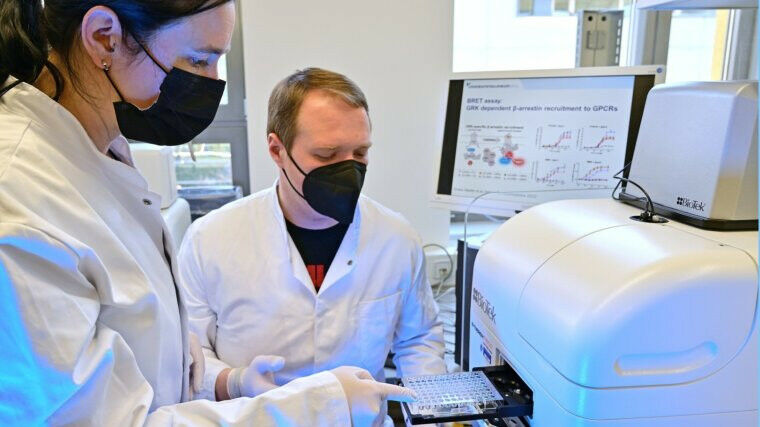 Julia Drube (l.) und Raphael Haider analysieren die Regulation G-Protein-gekoppelter Rezeptoren. Foto: Michael Szabó/UKJ - Ein Forschungsteam aus Jena und Bonn entwickelte ein Zellsystem zur Analyse der Regulation G-Protein-gekoppelter Rezeptoren. Zum Schutz vor einer Überreizung können diese pharmakologisch wichtigen Rezeptoren durch spezifische Enzyme im Zellinneren inaktiviert werden. Dieser Desensitisierungsmechanismus steht im Verdacht, bei der Entstehung des Gewöhnungseffekts an Schmerz-oder Asthmawirkstoffe eine Rolle zu spielen. Mit seiner jetzt im Journal Nature Communications vorgestellten Toolbox ermöglicht das Team rezeptorspezifisch die systematische Aufklärung des Desensitisierungsverhaltens, das wichtige Hinweise für die Toleranzentwicklung bei Wirkstoffkandidaten geben kann. Sie stehen im besonderen Fokus der Arzneimittelforschung - die G-Protein-gekoppelten Rezeptoren.