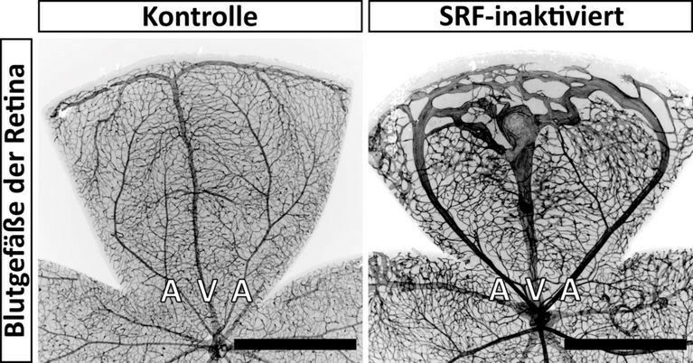 Retinale Blutgefäße in einer Kontrolle und bei einer gezielten Inaktivierung des Serum-Response-Faktors (SRF) in glatten Muskelzellen. In der Kontrolle gehen die Arterien (A) fließend in kleinste Mikrogefäße Über. Diese führen wiederum zu den Venen (V), welche das Blut zum Herzen zurückführen. Bei einer SRF-Inaktivierung in glatten Muskelzellen umgehen die Arterien weitestgehend die Mikrogefäße und führen direkt zu den Venen. Durch diese Abkürzung wird das umliegende Gewebe weniger mit Blut versorgt. Der schwarze Balken (rechts unten) entspricht 1 Millimeter.