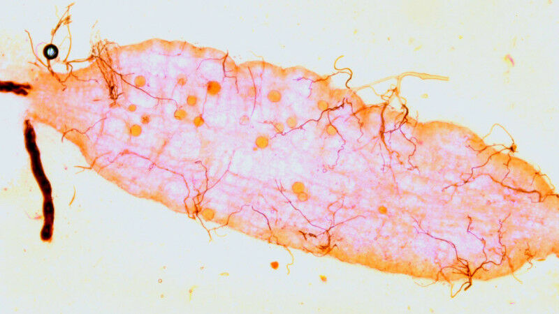 Malaria-Erreger entwickeln sich im Darm von Mücken. Dabei lassen sie sich bis zu ihrer Übertragung auf den Menschen Zeit. Auf dem Mikroskopbild eines Darms einer Mücke sind die Parasiten als gelbe Punkte zu erkennen.