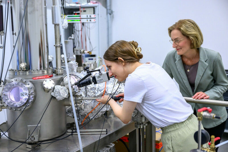 PhD candidate Katarzyna Kwiecien (left) and Anika Schlenhoff at the scanning tunnelling microscope. They can use the device to visualise the individual atoms in the surface of a sample
