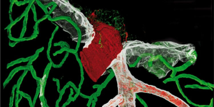 Mithilfe spezieller extrazellulärer Matrixmoleküle (weiß und grün) und zellulärer Marker (rot) können die Barrieren an der Oberfläche des Gehirns und der umgebenden Blutgefäße sichtbar gemacht werden.